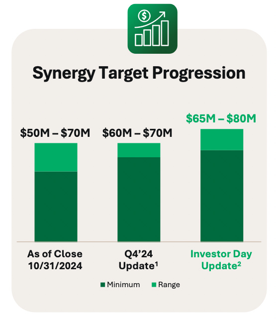 Management’s original synergy target of $50–70 million in run-rate cost savings within 18–24 months of close was raised to $65–80 million at last May’s investor day. Through Q3 2025, $52 million in synergies had already been actioned. This is ahead of schedule by any measure and demonstrates a management team capable of under-promising and over-delivering.