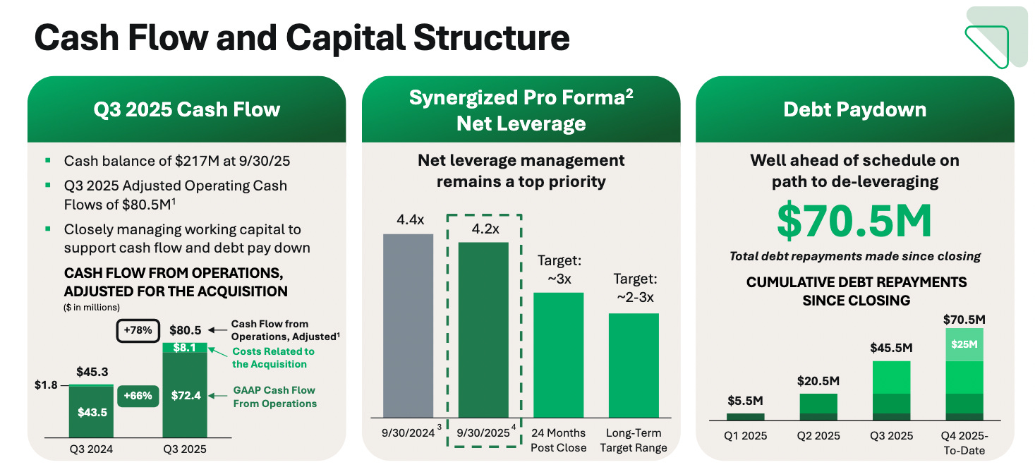 Post-acquisition net leverage stood at 4.3x. Management targeted 3.0x by year-end 2026, with a longer-term target of 2–3x. Through Q3 2025, FA made over $70 million in debt repayments and reduced borrowing rates by 50bps generating approximately $10 million in annual cash interest savings. Deleveraging is also currently ahead of schedule.